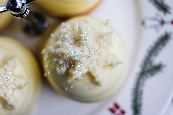 Temperer den hvide chokolade og dyp flødebollerne heri. Inden chokoladen størkner, så kan de evt. pyntes med chokolade sne og glimmer.